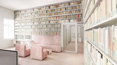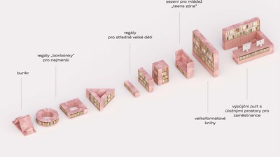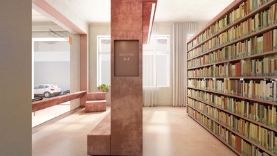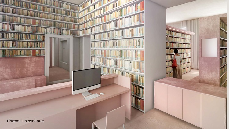 „Průjezd a zároveň hlavní vstup do knihovny chceme osadit novými dveřmi, které zároveň fungují jako poutač. Nabízíme tři různé varianty provedení, ze kterých bude vybráno v dalších fázích projektu. Podle architektonického návrhu bude prostor průjezdu vyčištěn a budou zde odhaleny původní pilastry, mezi kterými jsou nástěnky – výstavní prostor. Dveře do knihovny v přízemí budou nově prosklené. Přímo naproti vstupu chceme umístit výpůjční pult se zázemím pro personál. Hlavní místnost směrem do ulice bude celá věnovaná regálům s knihami na vypůjčení. Regály jsou v šedé barvě okolo stěn a v růžové v pravidelném rastru uprostřed místnosti. V druhém patře jsme připravili návrh pro dětské oddělení, které bude nově protažené přes celou šířku fasády. Prostor bude rozdělen na několik segmentů – prostor pro promítání s amfiteátrem, prostor s regály a teen zónu. Z návrhu vyplívá, že v druhém patře budovy budou umístěny kanceláře pro personál. V podkroví navrhujeme prosvětlení místností střešními okny,“ popisuje architektonický návrh zhotovitel PAPUNDEKL ARCHITEKTI s.r.o..
