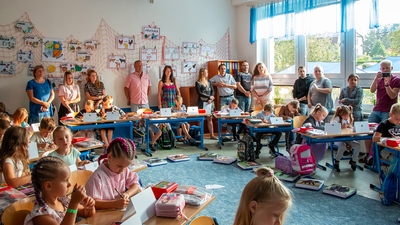 Na ZŠ V. Hejny zamířil starosta města Tomáš Prouza, na odloučené pracoviště školy v Horním Kostelci se vydala za správní odbor Petra Flašková, za nejmladšími žáčky do Olešnice vyrazila její kolegyně Simona Michelová a ve Lhotě prvňáčky přivítal místostarosta Jiří Regner.